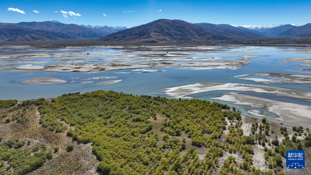 這是雅魯藏布江寬闊的河床和岸邊種植的樹木(2024年10月24日攝,無(wú)人機(jī)照片)。新華社記者 晉美多吉 攝