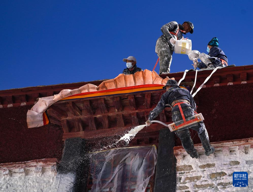 10月30日,布達(dá)拉宮管理處的工作人員在噴灑涂料。新華社記者 丁增尼達(dá) 攝
