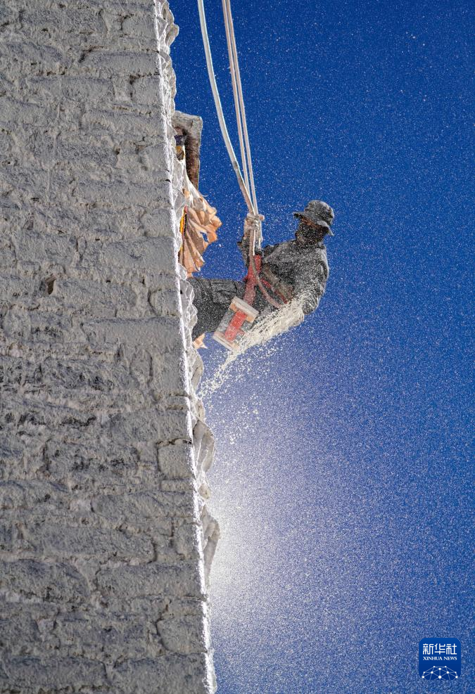 10月30日,布達(dá)拉宮管理處的工作人員在噴灑涂料。新華社記者 晉美多吉 攝
