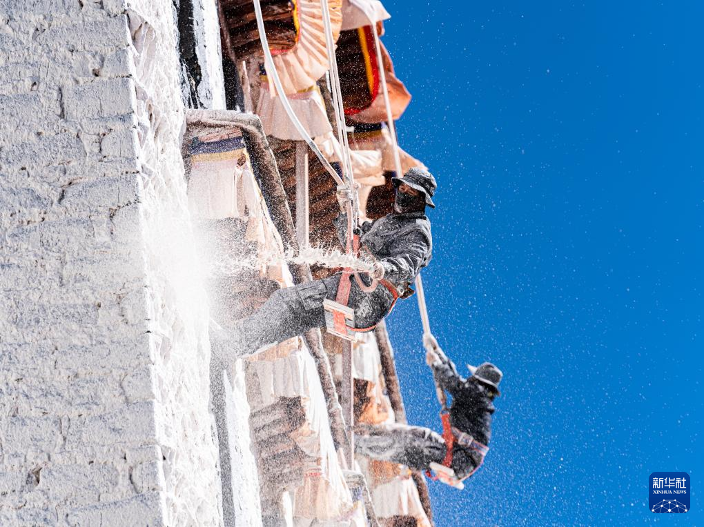 近期,西藏布達(dá)拉宮開始進(jìn)行一年一度的外墻粉刷工作。布達(dá)拉宮管理處的工作人員和志愿者一起,將牛奶、蜂蜜、白糖、紅糖、藏紅花等粉刷原料與各色石灰混合后,調(diào)出白色、紅色、黃色的專用涂料,再噴灑到布達(dá)拉宮外墻上,因此布達(dá)拉宮也被人們稱為“甜蜜的宮殿”。獨(dú)特配方的涂料更具黏性而且不易脫落,從而更好地保護(hù)古建墻體。