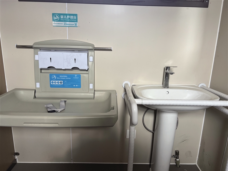 公廁內(nèi)部除了正常的蹲位,還設(shè)有第三衛(wèi)生間。第三衛(wèi)生間內(nèi)配有嬰兒護(hù)理臺(tái)、嬰兒安全座椅等設(shè)施。除此之外,第三衛(wèi)生間還設(shè)有安全扶手、智能馬桶等設(shè)備,方便腿腳不方便的老年人及殘疾人。智能馬桶旁還安裝有緊急報(bào)警器?!叭绻欣先嗽趲?,就可以按一下緊急報(bào)警器。這也是我們考慮到殘疾人、老年人如廁不方便,增設(shè)的人性化設(shè)計(jì)?!背嗔姓f。