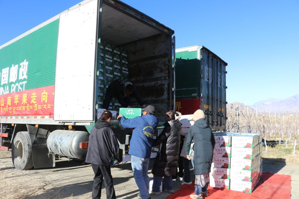 山南市扎囊縣矮化蘋(píng)果種植基地工作人員正在裝車。(山南市委宣傳部供圖)