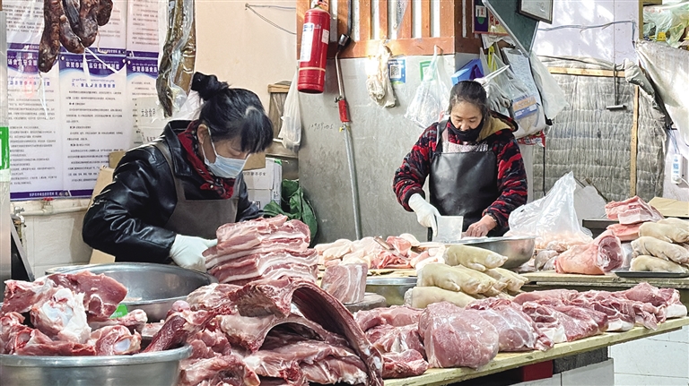 納金綜合批發(fā)商貿(mào)城豬肉攤店老板魏女士介紹,目前豬肉銷量上漲,價(jià)格和之前相差不多,其中冷鮮豬排每斤28元、豬五花肉每斤18元、豬棒骨每斤10元、豬里脊(不帶皮)每斤16元,新鮮香腸每斤40元。她告訴記者:“我們店的豬肉質(zhì)量很好,賣得特別好,平時(shí)除了賣給散客外,也經(jīng)常有餐飲店來(lái)我們這訂購(gòu)豬肉?!背素i肉,牛羊肉的價(jià)格也較為平穩(wěn),其中牛肉每斤40元左右、牛排每斤35元左右、羊肉和羊排每斤都是35元左右。此外,雞鴨鵝等禽類商品銷量上漲,價(jià)格基本與前幾月持平。