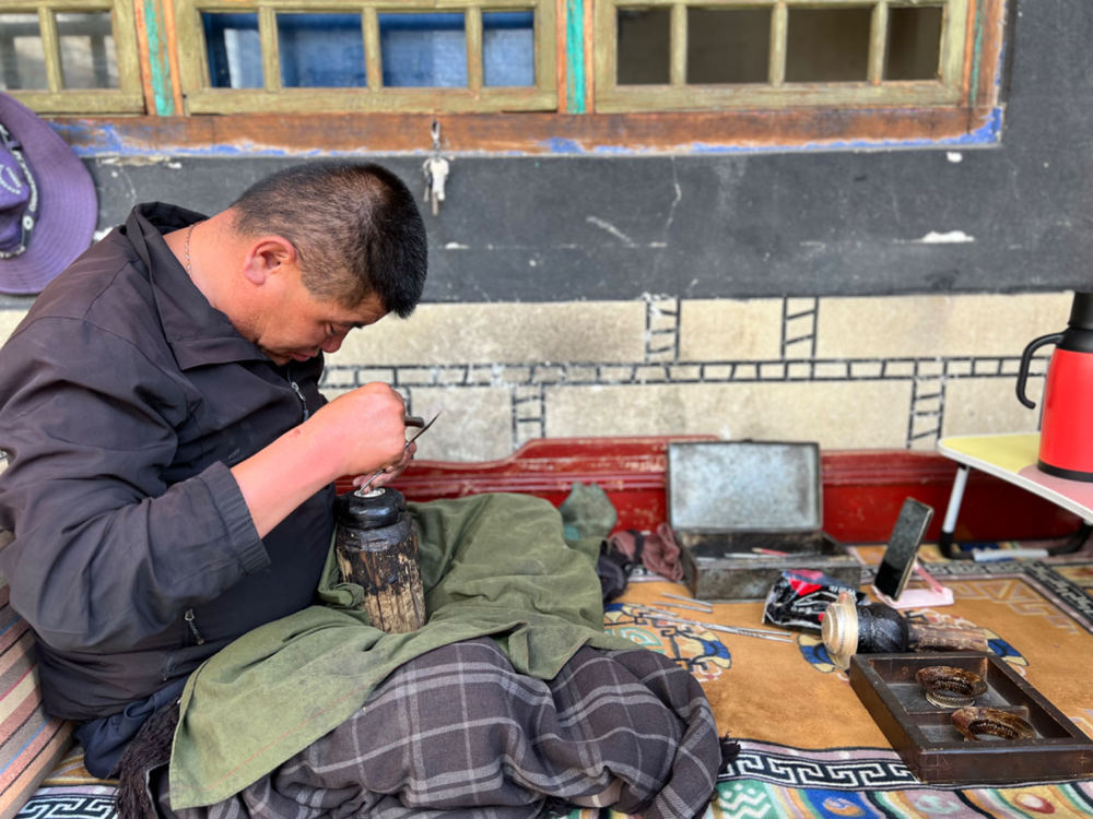 邊巴扎西正在制作銀器