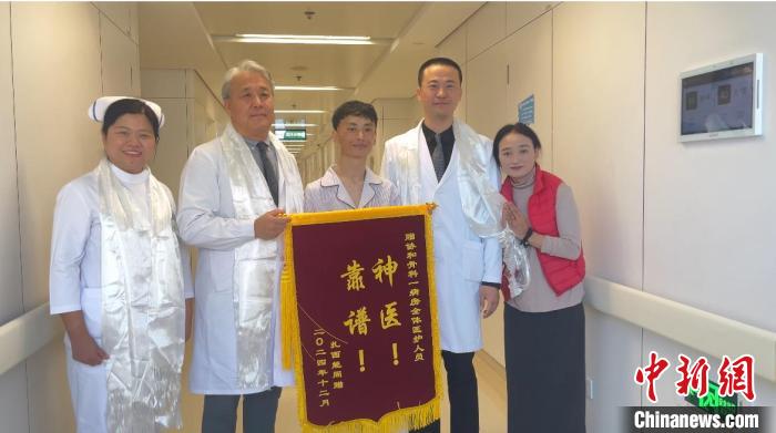 12月3日,在北京協(xié)和醫(yī)院接受脊柱側彎矯形手術的藏族青年扎西能周(右三)和母親(右一)向醫(yī)院骨科一病房的醫(yī)護人員獻哈達并送上錦旗。黃欣欣 攝