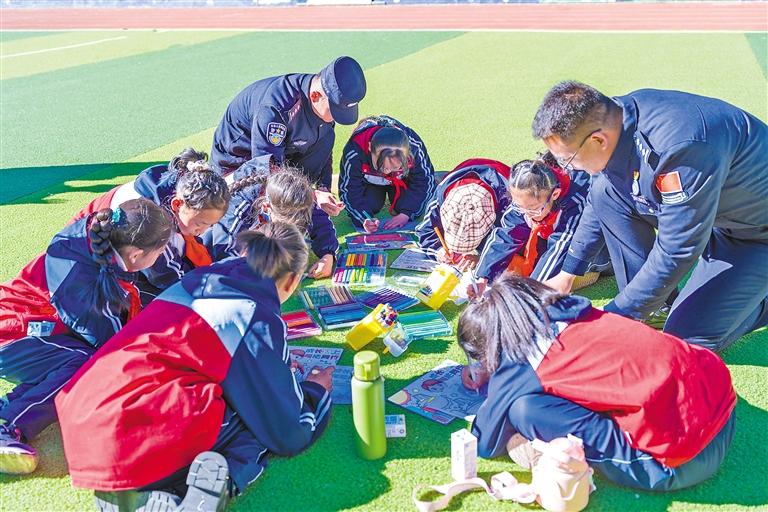 圖為亞東出入境邊防檢查站的民警和學生一同創(chuàng)作“憲法伴我成長”手抄報。通訊員 李錦輝 攝