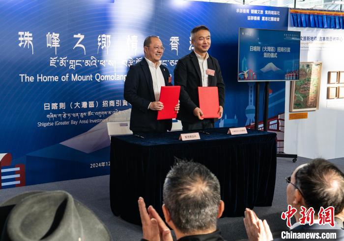 圖為日喀則市委副書記、常務副市長彭一浩(右)和紫荊雜志社總編輯袁建簽署招商引資協(xié)議。中新網(wǎng)記者 侯宇 攝