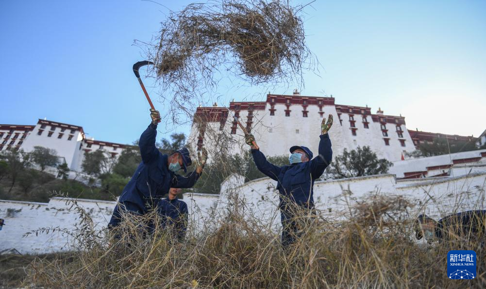 布宮消防救援大隊(duì)隊(duì)員在紅山上除草,消除冬季布達(dá)拉宮火災(zāi)隱患(2019年11月6日攝)。新華社記者 晉美多吉 攝