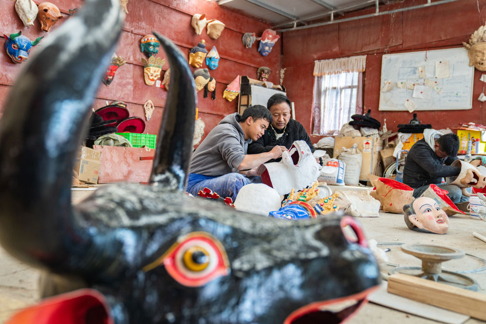 拉薩達(dá)孜區(qū)雪鄉(xiāng)民間傳統(tǒng)手工藝農(nóng)民專業(yè)合作社的工匠在合作社門前的空地上佩戴檢查做好的西藏傳統(tǒng)面具。