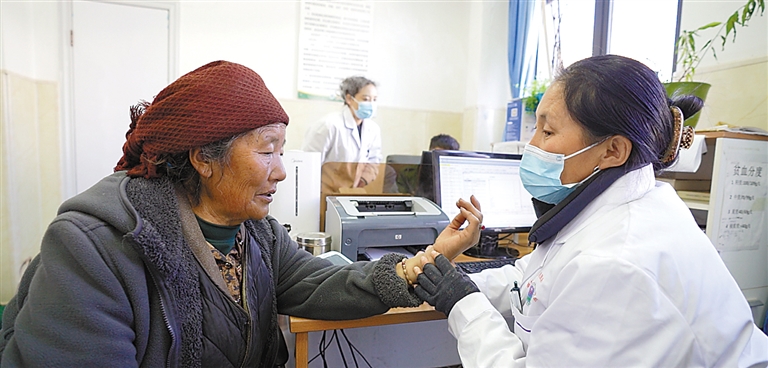 圖為墨竹工卡縣扎雪鄉(xiāng)衛(wèi)生院醫(yī)生為患者把脈。記者 格桑倫珠 攝