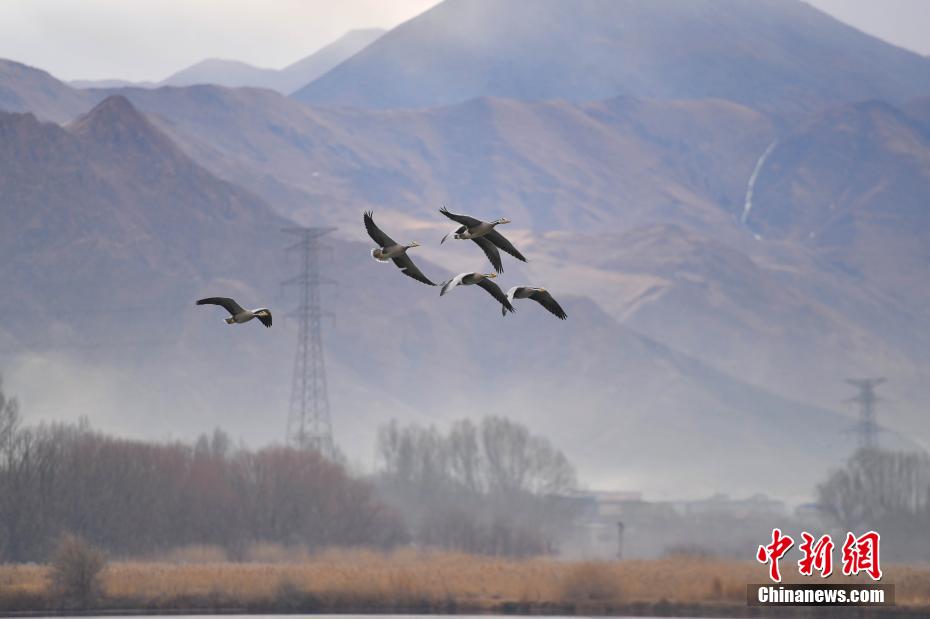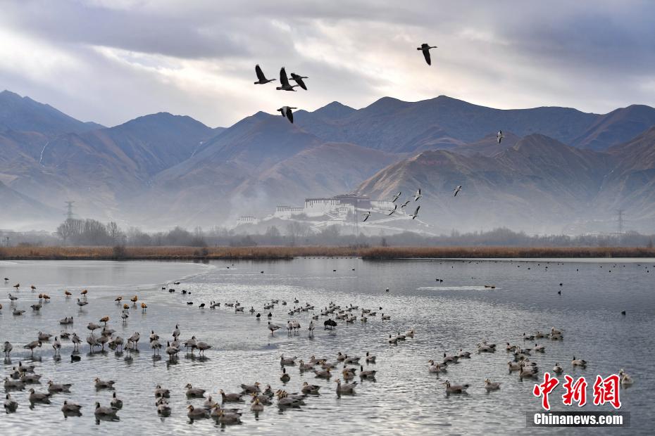 12月29日,冬日早晨,拉薩美如畫。拉薩河被晨光染成金色,河水靜靜流淌。西藏自治區(qū)拉薩市的拉魯濕地國家級自然保護區(qū)內(nèi),候鳥歡快,忙著覓食、嬉戲。遠處,布達拉宮與拉魯濕地相互映襯,構(gòu)成了一幅絕美畫卷。圖為12月29日,在拉魯濕地越冬的候鳥成群結(jié)隊。貢確 攝