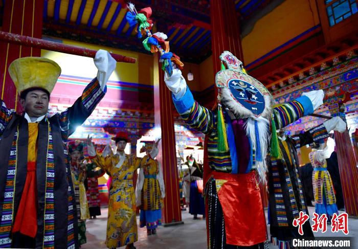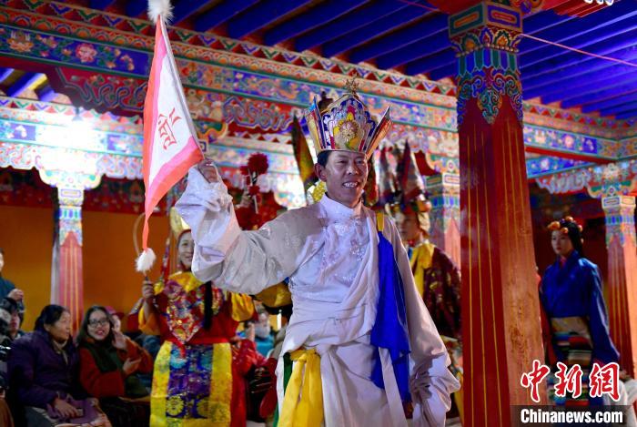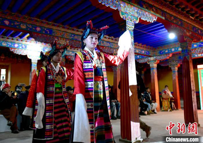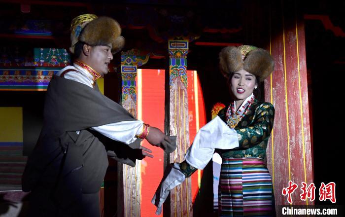 1月2日晚,一場(chǎng)視聽(tīng)結(jié)合、感官沉浸的拉薩傳統(tǒng)演藝服飾秀在西藏自治區(qū)拉薩市喜德林古建大院上演。囊瑪堆諧、覺(jué)木隆藏戲等非遺的演繹,讓觀眾領(lǐng)略到拉薩深厚的文化底蘊(yùn)。圖為拉薩傳統(tǒng)演藝服飾秀演出現(xiàn)場(chǎng)。中新社記者 李林 攝