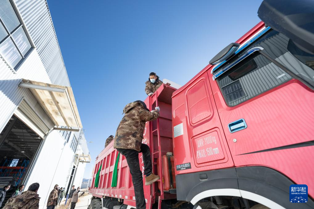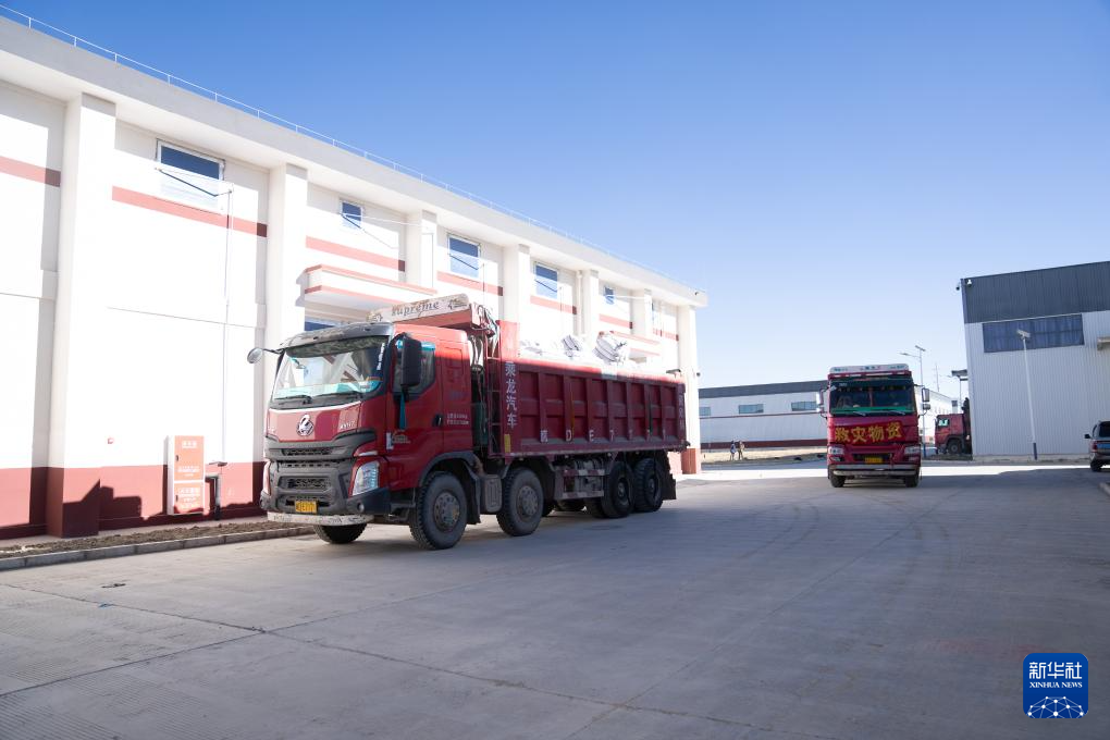 1月8日,在日喀則市經(jīng)開(kāi)區(qū)物資儲(chǔ)備倉(cāng)庫(kù),裝好抗震救災(zāi)物資的車輛駛出園區(qū)。新華社記者 丁增尼達(dá) 攝