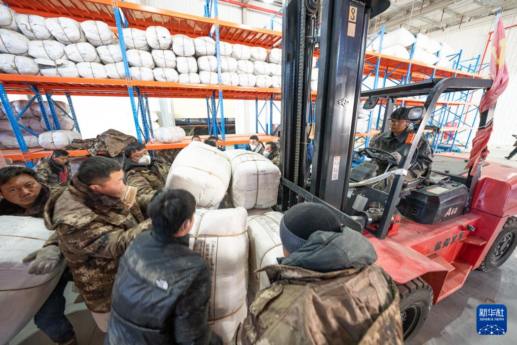 1月8日,在日喀則市經(jīng)開(kāi)區(qū)物資儲(chǔ)備倉(cāng)庫(kù),當(dāng)?shù)馗刹咳罕姲徇\(yùn)抗震救災(zāi)物資。新華社記者 丁增尼達(dá) 攝