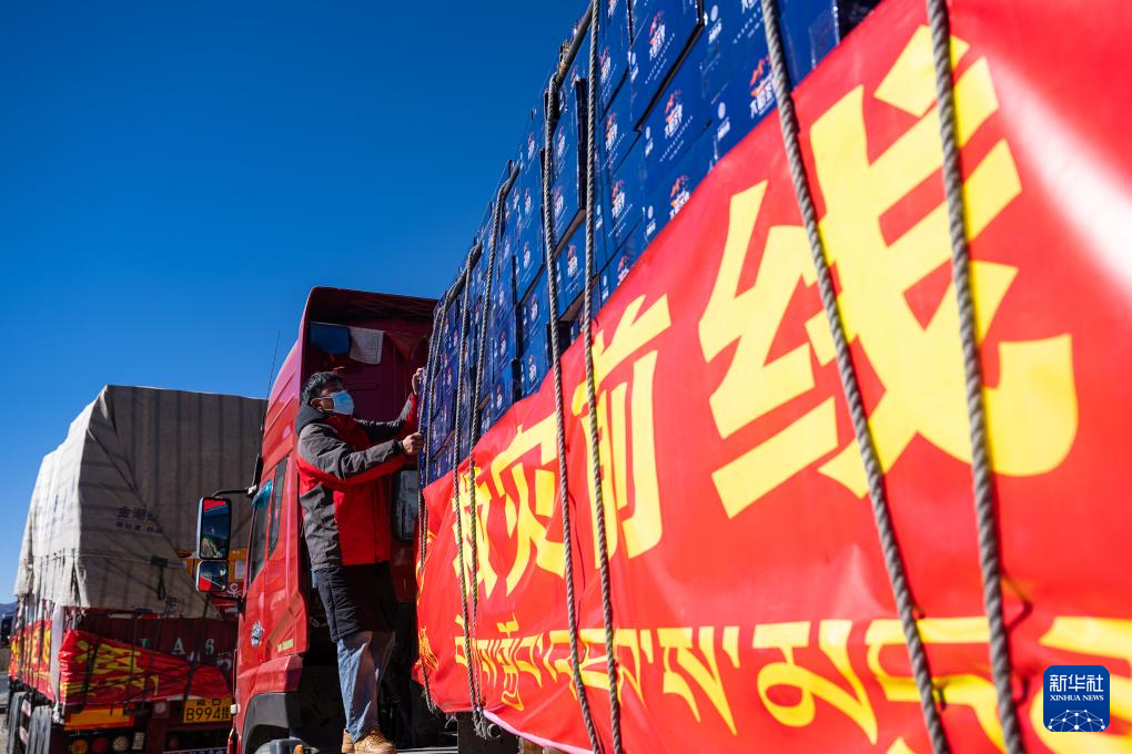 1月8日,在日喀則市境內(nèi)的318國(guó)道旁,當(dāng)?shù)仄髽I(yè)工作人員在用繩子固定抗震救災(zāi)物資。新華社記者 丁增尼達(dá) 攝