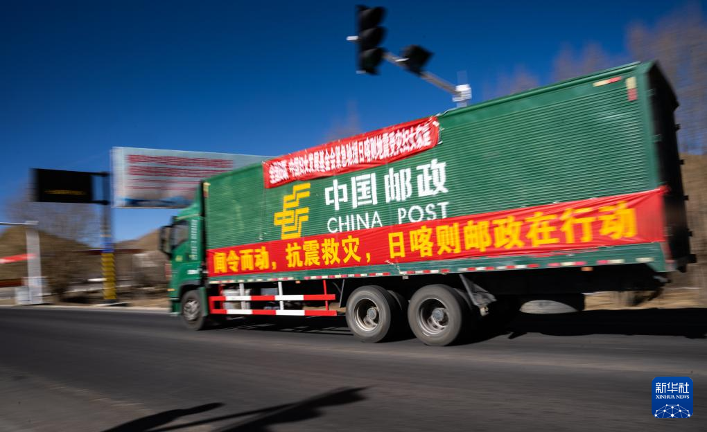 1月8日,在日喀則市境內(nèi)的318國(guó)道旁,中國(guó)郵政的抗震救災(zāi)物資運(yùn)輸車輛向震中方向駛?cè)?。新華社記者 丁增尼達(dá) 攝