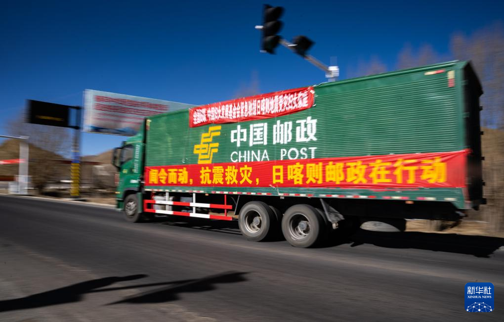 1月8日,在日喀則市境內(nèi)的318國(guó)道,中國(guó)郵政的抗震救災(zāi)運(yùn)輸車輛向?yàn)?zāi)區(qū)方向駛?cè)ァP氯A社記者 丁增尼達(dá) 攝