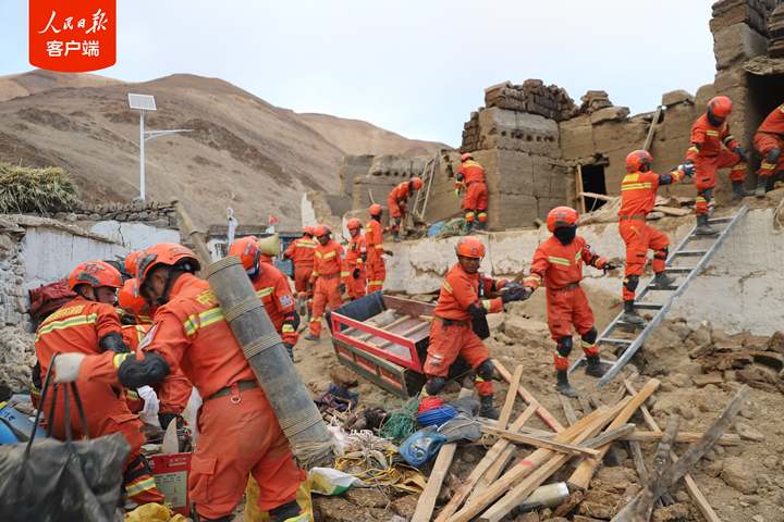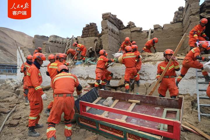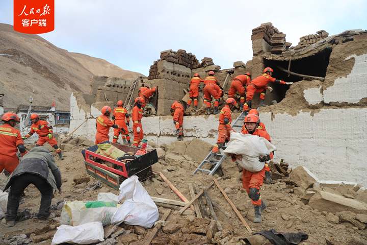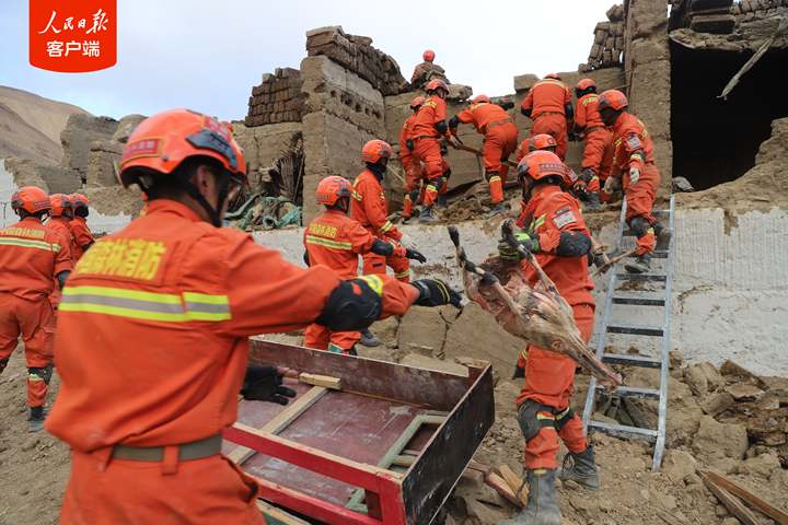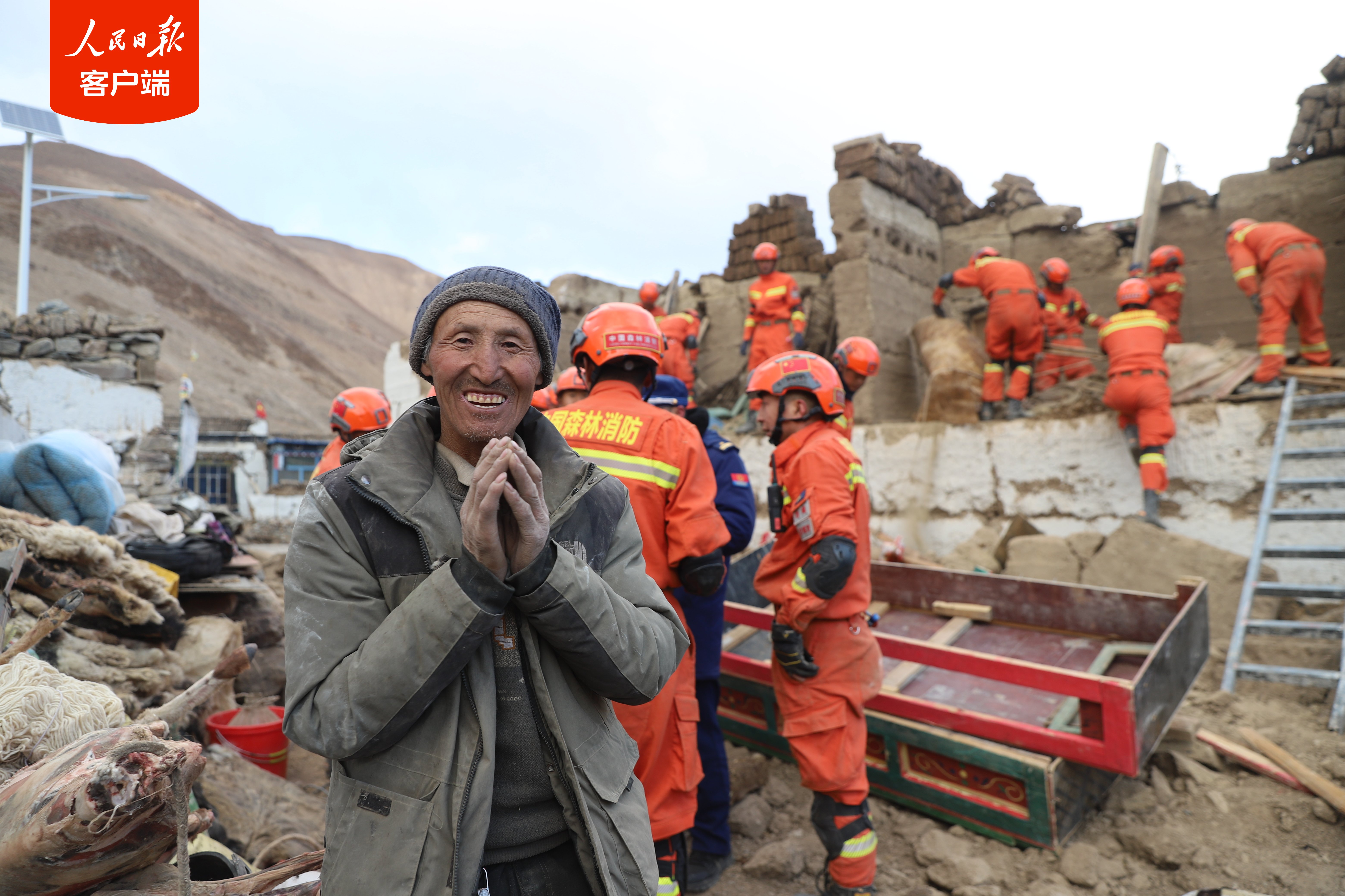 1月7日,西藏日喀則市定日縣發(fā)生6.8級地震后,西藏森林消防總隊指戰(zhàn)員第一時間趕赴受災(zāi)嚴(yán)重的措果鄉(xiāng)野江村展開救援。救援人員把埋在廢墟里的牦牛和生活物資搶救出來后,村民雙手合十,真誠感謝黨和國家,感謝救援人員。