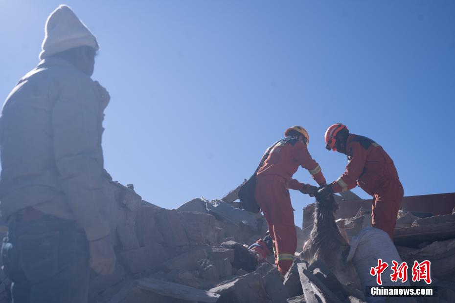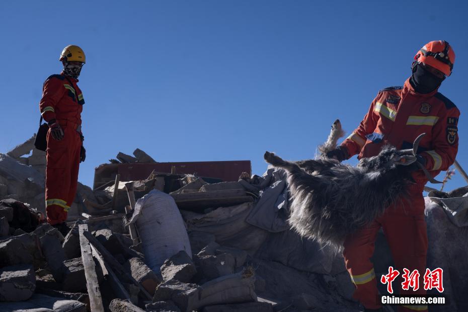 1月8日,西藏自治區(qū)日喀則定日縣長(zhǎng)所鄉(xiāng)強(qiáng)嘎村,西藏消防救援總隊(duì)救援人員為民眾找回地震掩埋的羊。1月7日9時(shí)5分,西藏自治區(qū)日喀則市定日縣發(fā)生6.8級(jí)地震,震源深度10公里。中新社記者 貢嘎來松 攝
