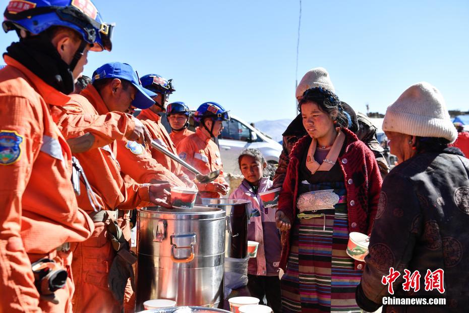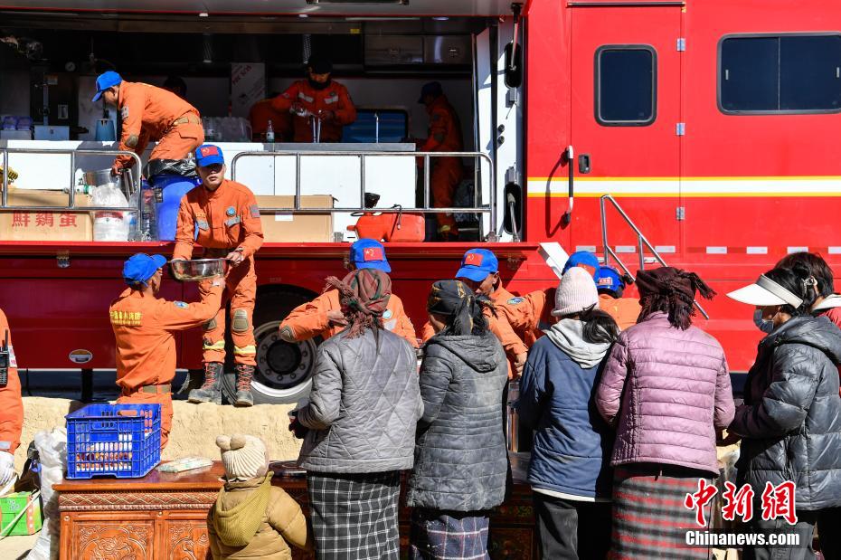 1月9日,西藏自治區(qū)定日縣曲洛鄉(xiāng)措昂村安置點(diǎn),西藏自治區(qū)森林消防總隊(duì)救援人員為受災(zāi)民眾提供飲食。當(dāng)日,位于西藏自治區(qū)定日縣曲洛鄉(xiāng)措昂村安置點(diǎn),西藏各級(jí)救援人員和愛(ài)心企業(yè)不斷轉(zhuǎn)運(yùn)、發(fā)放生活物資、搭建活動(dòng)板房、全力保障受災(zāi)民眾的飲食供應(yīng)等,保障受災(zāi)民眾基本生活。中新社記者 貢嘎來(lái)松 攝