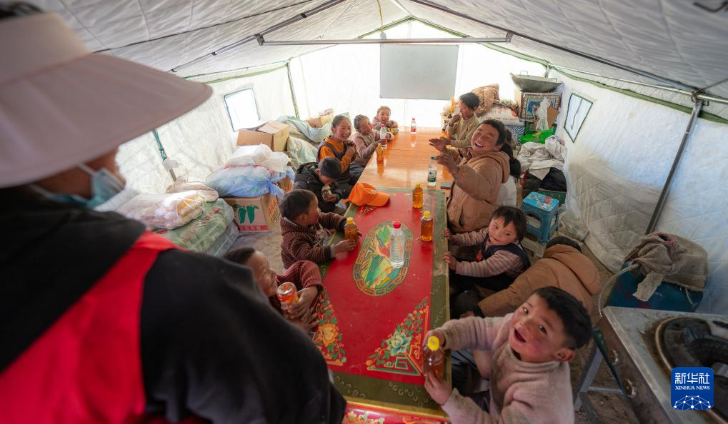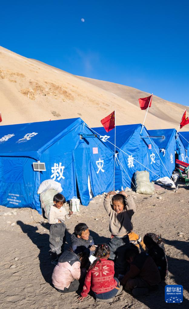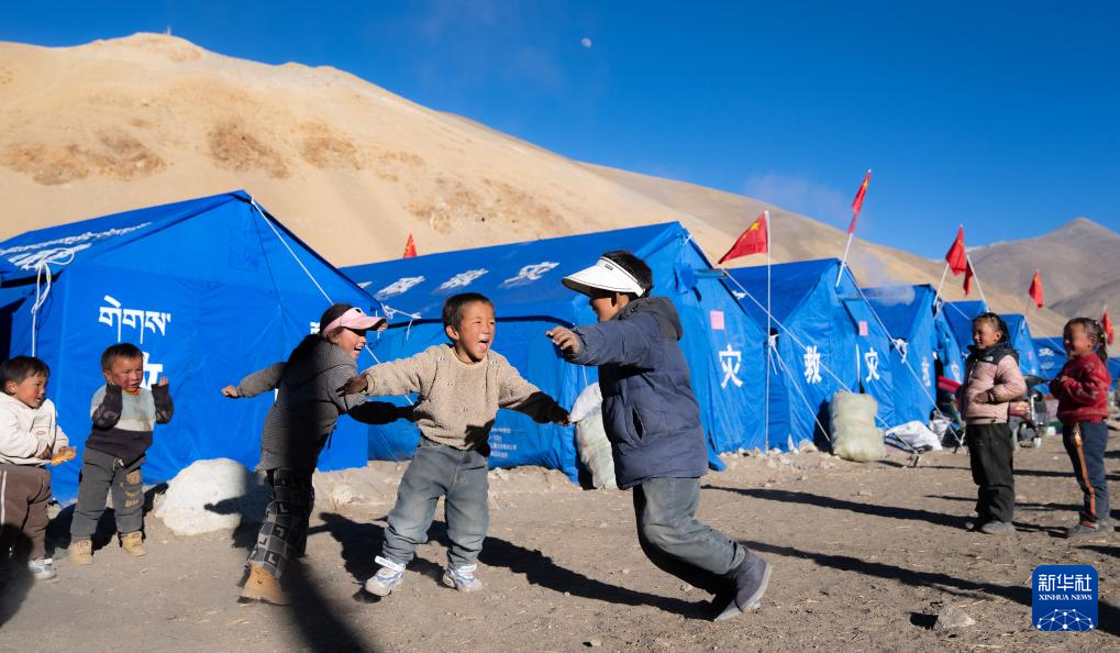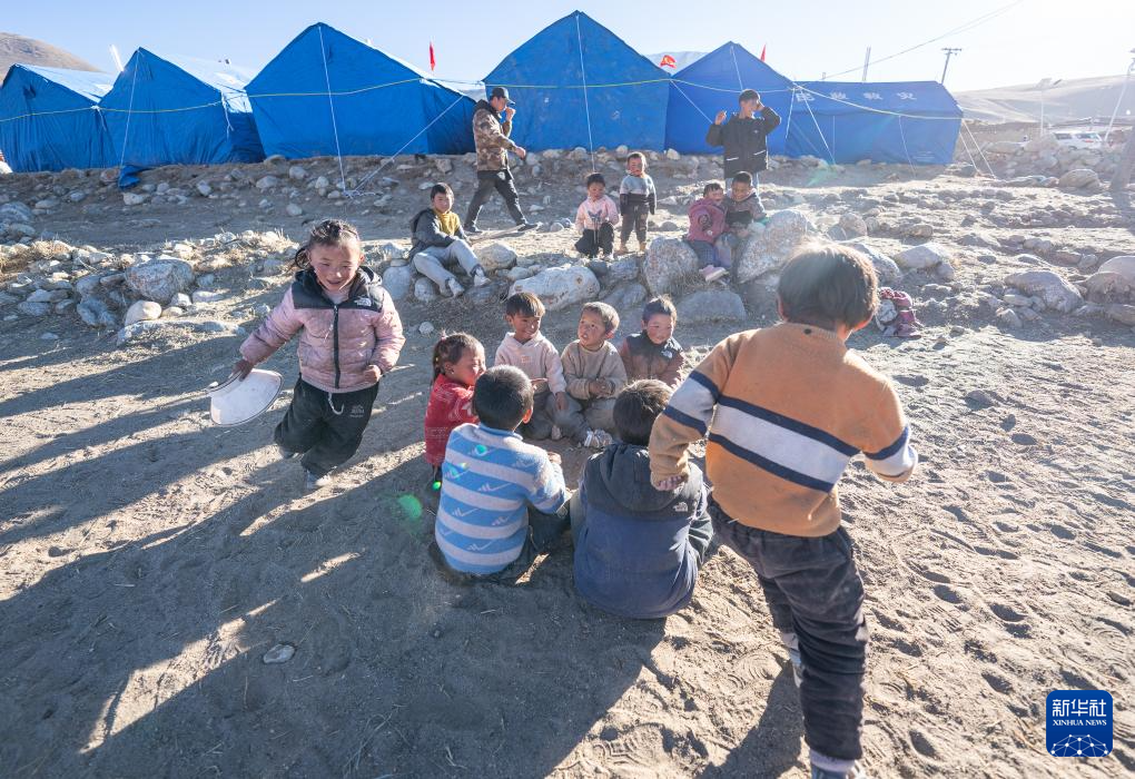 1月10日,在定結縣郭加鄉(xiāng)乃村安置點,孩子們在學生臨時學習區(qū)做游戲。新華社記者 丁增尼達 攝