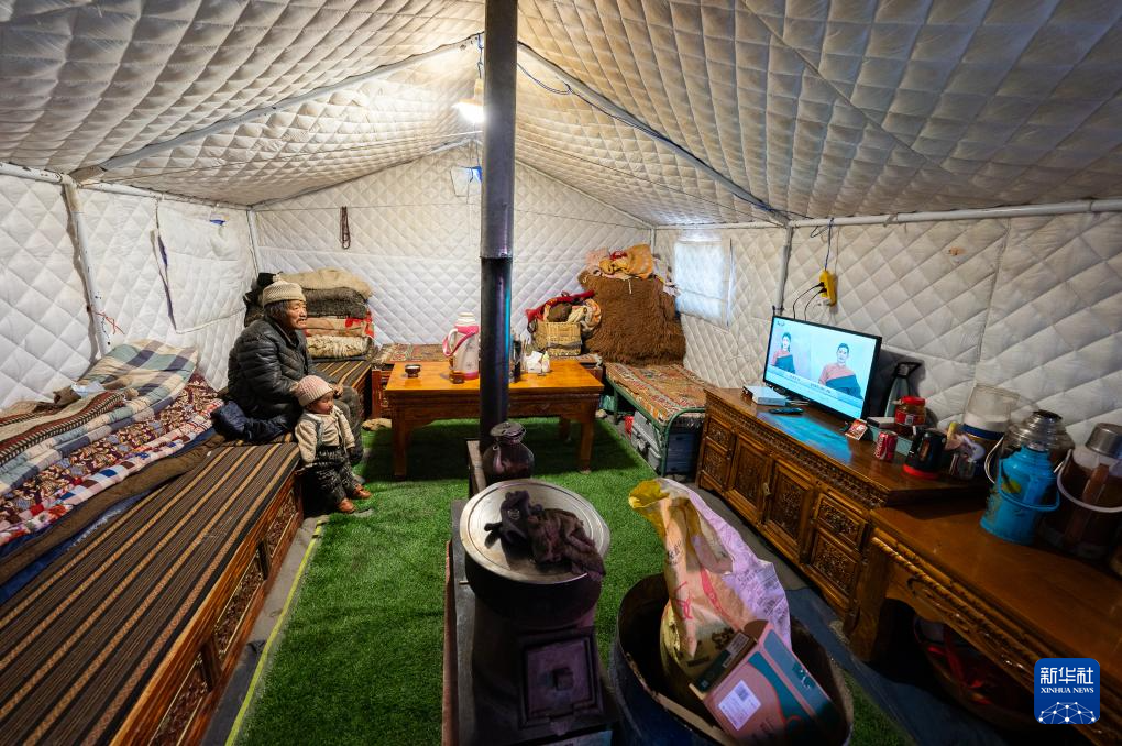 1月10日,在定結縣郭加鄉(xiāng)乃村安置點,老人和孩子在救災帳篷里看電視。新華社記者 丁增尼達 攝