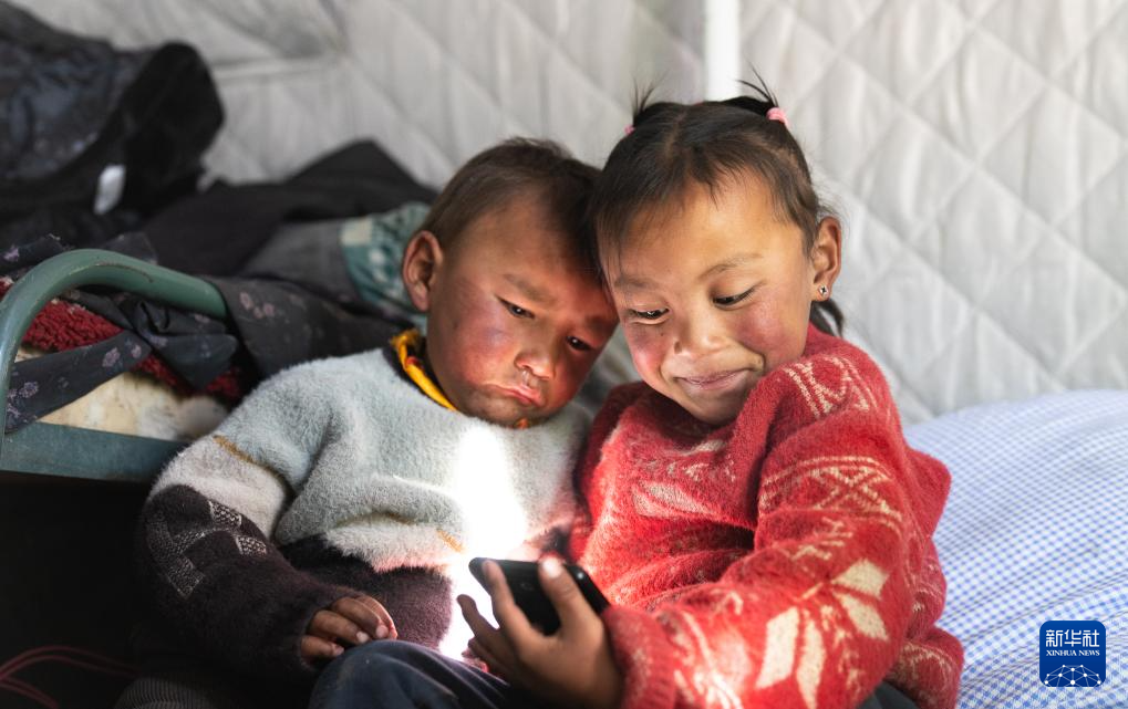 1月10日,在定結縣郭加鄉(xiāng)切村安置點,姐弟倆在帳篷里依偎著玩手機。新華社記者 丁增尼達 攝