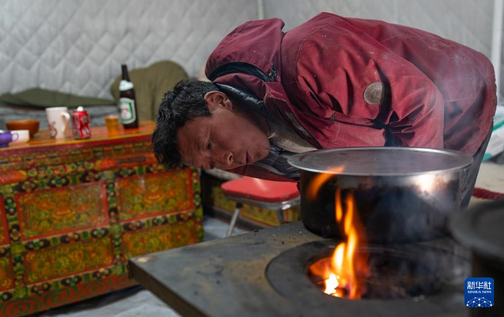 1月10日,在定結縣郭加鄉(xiāng)切村安置點,群眾在救災帳篷里生火。新華社記者 丁增尼達 攝