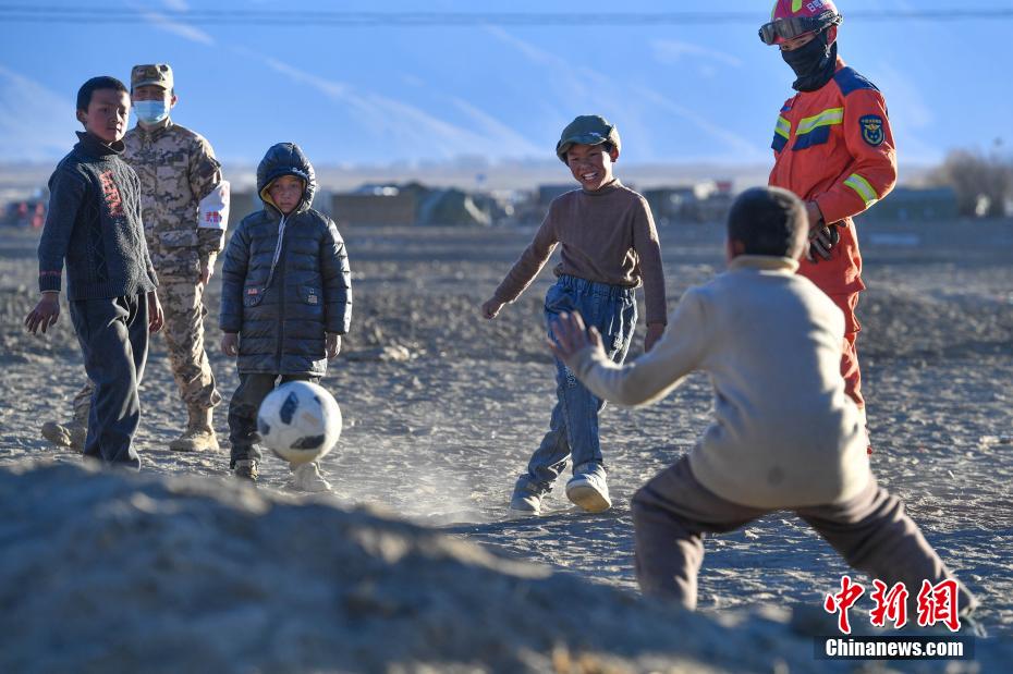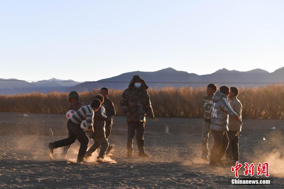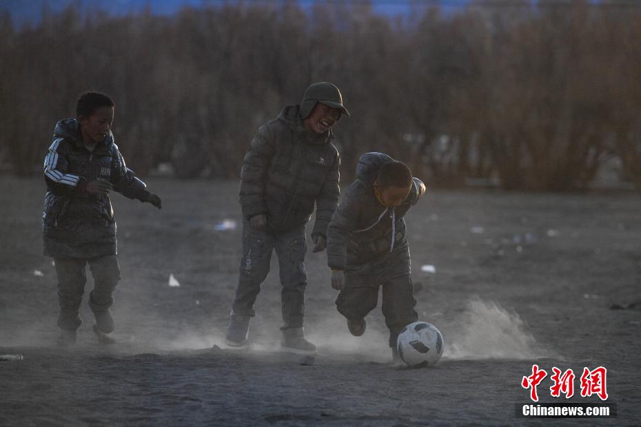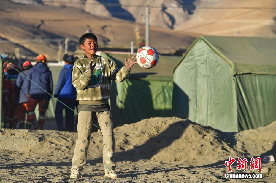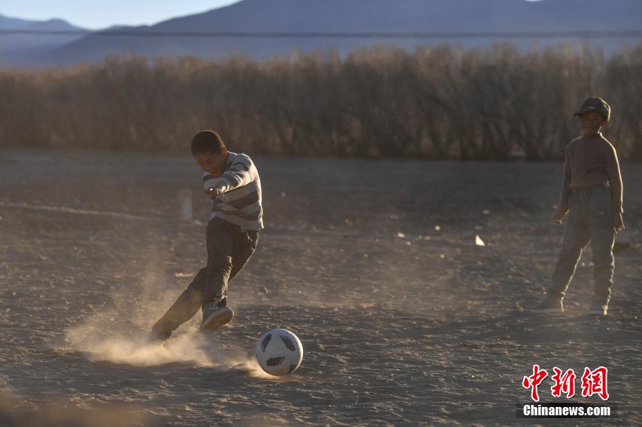 西藏定日縣震后第四天 夕陽(yáng)下孩子踢球暖人心