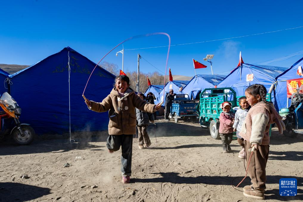 1月11日,小朋友在普村安置點(diǎn)跳繩。新華社記者 姜帆 攝