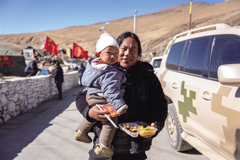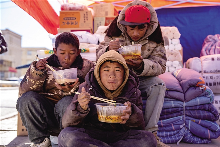 在長所鄉(xiāng)森嘎村安置點(diǎn),來自定日縣崗嘎鎮(zhèn)的普桑和其他3名村民正在給受災(zāi)群眾與救援人員分發(fā)“巴突”(藏語音譯,意為面疙瘩)。“今天上午我們做的‘強(qiáng)歸’(藏語音譯,意為煮青稞酒和糌粑),中午做的‘巴突’,這是我們的傳統(tǒng)美食,吃了全身都會(huì)暖乎乎的。大家互幫互助,一切都會(huì)慢慢好起來的?!逼丈Uf。