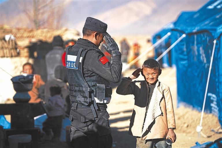 “照片上的這位民警是我們的同事,叫普次仁。1月9日,他在村里的臨時(shí)安置點(diǎn)巡邏的時(shí)候,看到一個(gè)小男孩,便將自己手中的飲料遞給他。沒(méi)想到這個(gè)叫達(dá)瓦扎西的小男孩很認(rèn)真地給他敬了個(gè)禮?!倍ńY(jié)縣公安局應(yīng)急救援小分隊(duì)隊(duì)員高靜說(shuō),“照片是我在定日縣措果鄉(xiāng)吉翁村拍的?!?/p>