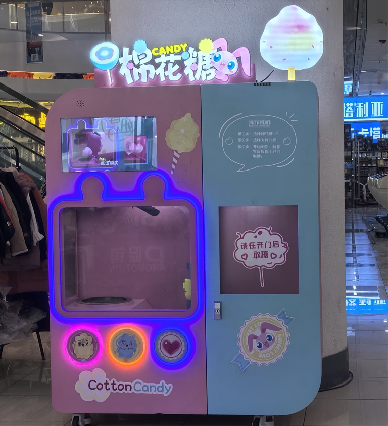 除了自助游戲機(jī),自助棉花糖機(jī)也是一大亮點(diǎn)。在拉薩市多家大型商超內(nèi),自助棉花糖機(jī)成為了孩子們的新寵。記者走訪發(fā)現(xiàn),目前拉薩各大商場(chǎng)內(nèi)的棉花糖機(jī)大多為同一品牌,機(jī)子中的棉花糖有42種,一個(gè)棉花糖售價(jià)19.9元。市民可以根據(jù)口味、顏色、造型選擇棉花糖,操作流程也十分便捷,選購(gòu)后掃碼支付即可。