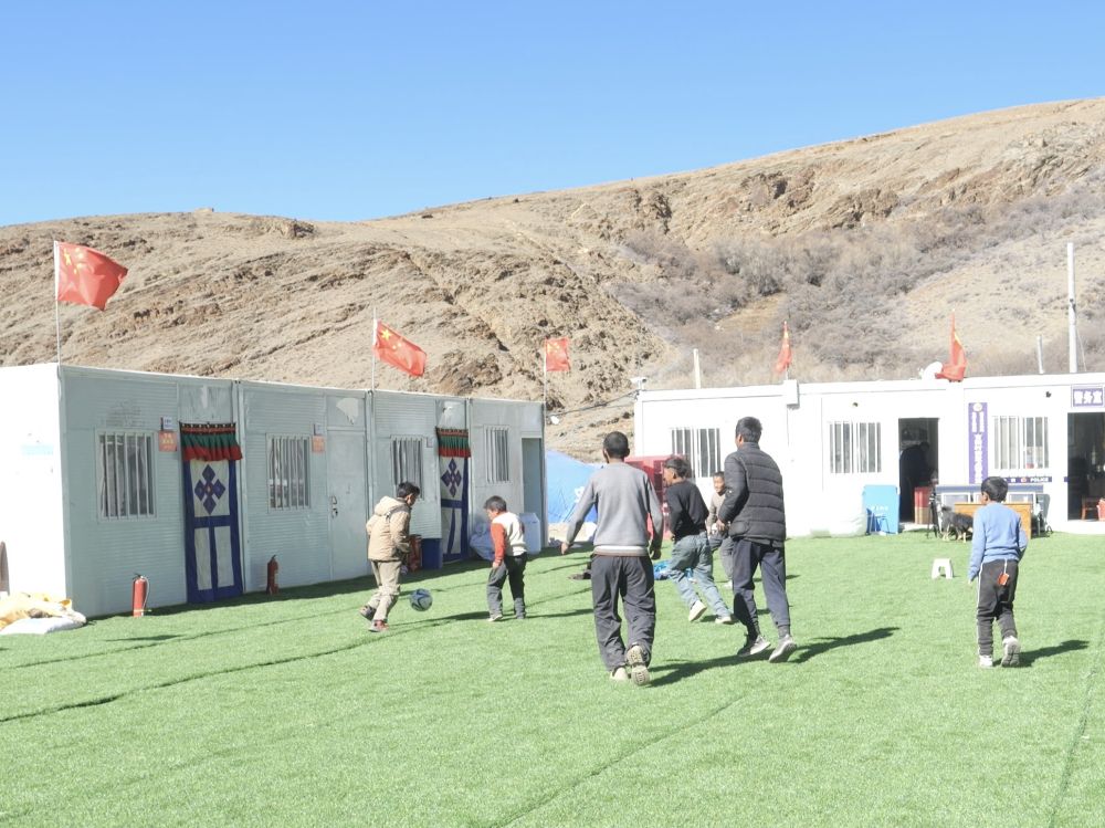 1月27日,在定日縣長(zhǎng)所鄉(xiāng)古榮村板房安置點(diǎn),孩子們正在踢足球。(受訪者供圖)