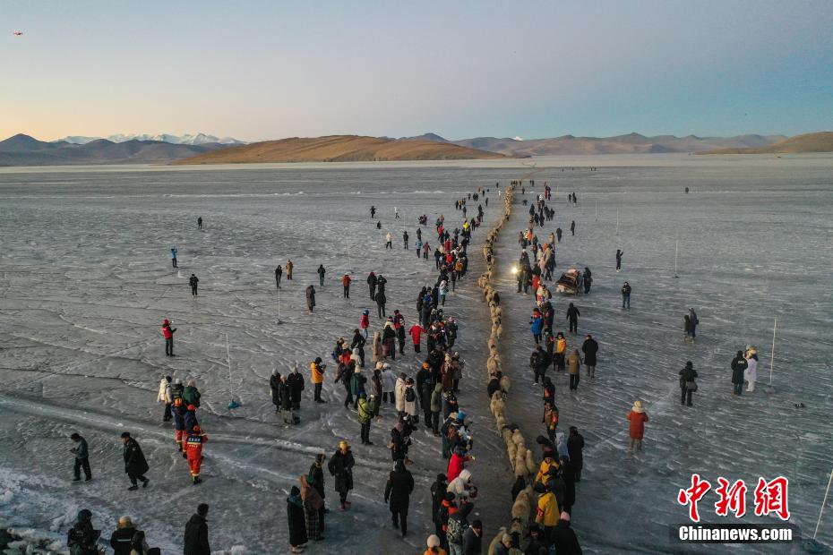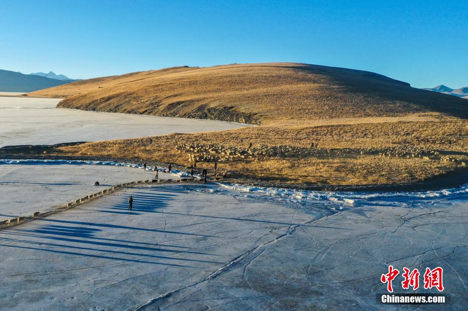 2月7日,西藏山南市浪卡子縣推瓦村1400多只羊通過普莫雍錯冰湖,前往湖心島。據(jù)悉,位于西藏山南市浪卡子縣的推瓦村,平均海拔約5070米,是世界上海拔最高的行政村,以牧業(yè)為主。由于推瓦村海拔高、夏季短,草場無法為羊群提供充足的過冬飼料,因此,每年高原最冷的時候,推瓦村牧民會把羊群趕到普莫雍錯水草豐茂的湖心島,依靠島上的草料度過最寒冷的冬期。圖為牧民準備趕羊轉(zhuǎn)場度過最寒冷冬期。(無人機照片)中新社記者 貢嘎來松 攝