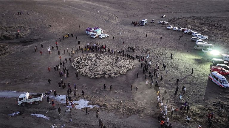 2月7日凌晨6點,記者抵達普莫雍錯。彼時,滿天繁星閃爍,冰湖在星光映照下,幽藍深邃,宛如一片凝固的夢幻之境。清晨的寒風凜冽刺骨,可推瓦村的牧羊人們早已開啟了忙碌的一天。8點,儀式結束,趕羊活動正式拉開帷幕。幾位牧羊人率先行動,在冰面上撒下爐灰,為的是給羊群鋪設“防滑步道”。一名牧羊人輕輕抱起小羊,率先踏上冰面,身后成群的羊緊隨其后,步伐緩慢而有序。冰面上,羊群細碎的腳步聲與冰層偶爾發(fā)出的輕微碎裂聲交織在一起,恰似大自然輕聲吟唱的歌謠。