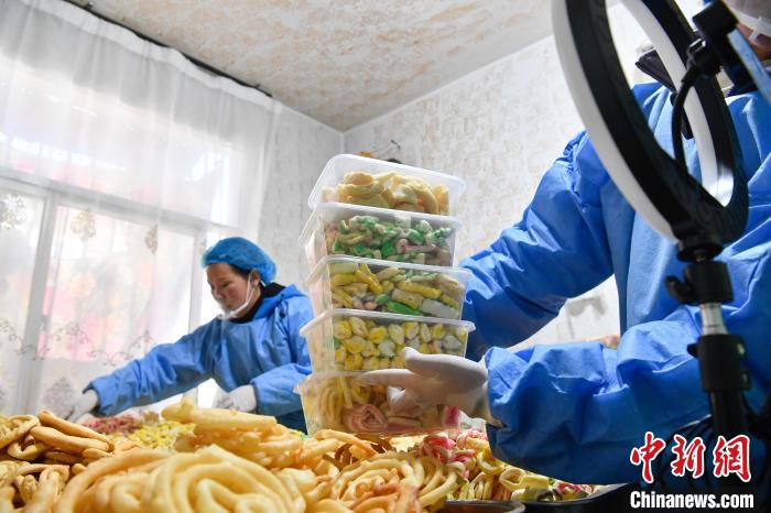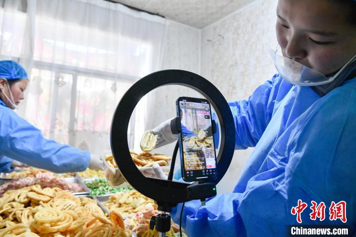2月10日,西藏拉薩市林廓北路一家卡塞店里,工人在直播賣卡塞。“卡塞”是一種油炸面食,是藏歷新年必不可少的食物。隨著藏歷新年的日益臨近,古城拉薩各個加工銷售“卡塞”的店鋪飄出陣陣香味。中新社記者 貢嘎來松 攝