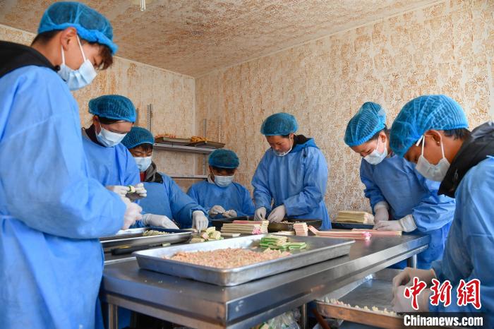 2月10日,西藏拉薩市林廓北路一家卡塞店里,工人在制作卡塞?!翱ㄈ笔且环N油炸面食,是藏歷新年必不可少的食物。隨著藏歷新年的日益臨近,古城拉薩各個加工銷售“卡塞”的店鋪飄出陣陣香味。中新社記者 貢嘎來松 攝