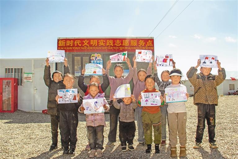圖為定日縣長所鄉(xiāng)嘎旦村的孩子們展示自己畫。記者 馬曉艷 旦增嘎瓦 攝