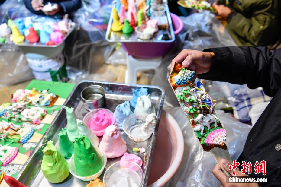 2月15日,手工藝人在拉薩制作酥油花。隨著藏歷新年臨近,酥油花在拉薩年貨市場上熱銷。酥油花在藏語中稱為“孜扎”,是藏族民眾家庭中必備的年貨之一。