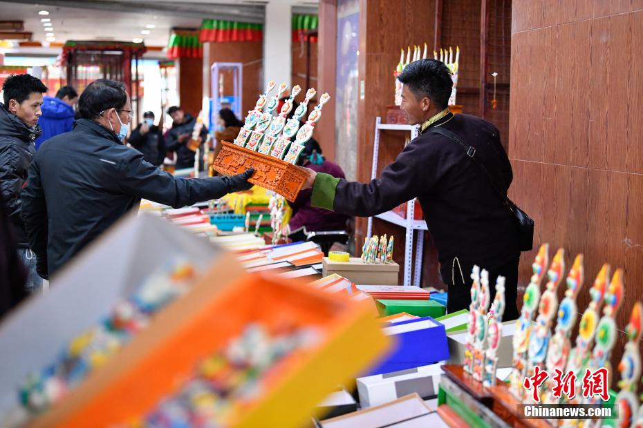 2月15日,拉薩市民在八廓商城選購年貨酥油花。隨著藏歷新年臨近,酥油花在拉薩年貨市場上熱銷。酥油花在藏語中稱為“孜扎”,是藏族民眾家庭中必備的年貨之一。