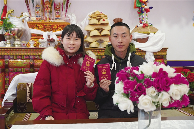 “我們?cè)谝黄?年了,是表姐牽的紅線?!钡┰龈峦吣樕涎笠缰腋5男θ荩従徴f道,“初次見到卓嘎,我就對(duì)她心生好感。相處一段時(shí)間后,我發(fā)現(xiàn)她性格溫柔,和我特別合拍,于是鼓起勇氣向她表白?!彼_心地展示著剛剛領(lǐng)到的結(jié)婚證,“情人節(jié)是個(gè)好日子,我們?cè)缇陀?jì)劃好今天領(lǐng)證,現(xiàn)在終于如愿以償。以后情人節(jié)和結(jié)婚紀(jì)念日合二為一,既能少買一份禮物,也不用擔(dān)心忘記啦?!?/p>