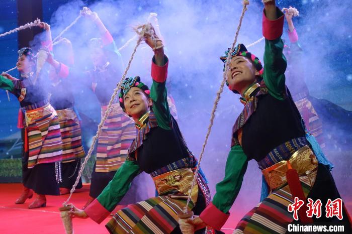 2月18日晚,中國駐尼泊爾使館在加德滿都舉辦藏歷木蛇新年招待會。圖為中國西藏山南市藝術(shù)團表演舞蹈《織夢》。中新社記者 崔楠 攝