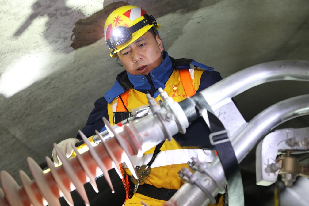 春運(yùn)期間,接觸網(wǎng)工人劉海軍在拉林鐵路色拉丘隧道內(nèi)為接觸網(wǎng)更換絕緣子。(拉巴次仁攝)