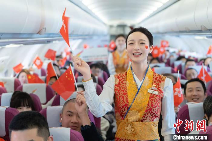 2月19日,西藏航空“拉薩-成都天府-香港”航線開通。圖為航班上舉行首航慶祝儀式。西藏航空供圖