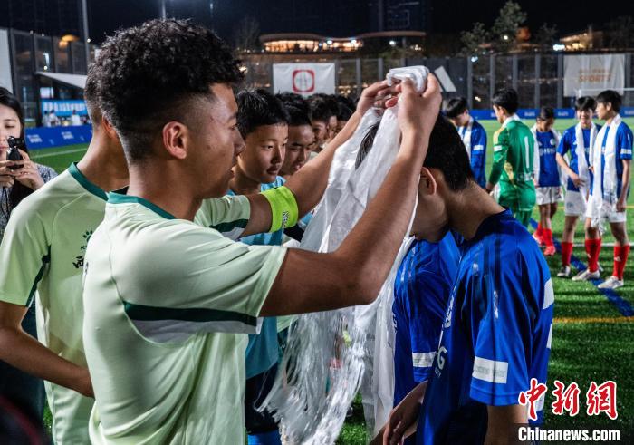 18日晚的香港西沙GO PARK球場,一場“跨越山?!钡淖闱虮荣愓诖碎g舉行,西藏青少年組成雪域雛鷹隊與香港東方體育會足球隊U16隊在綠茵場上以球會友。