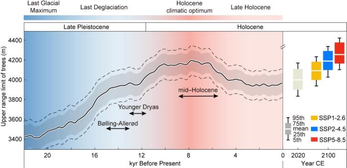 研究結果顯示,青藏高原平均樹線海拔在末次冰期最低(約3426米);全新世大暖期(距今約8000年)達到最高(約4187米),比當前的平均樹線(約4009米)高約180米。冰期與間冰期樹線波動幅度高達850米,導致間冰期高山特有物種棲息地面積僅為冰盛期的約50%。