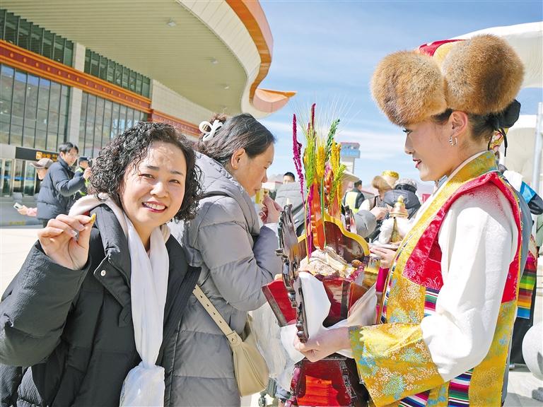 圖為旅游團受到隆子縣干部群眾的熱烈歡迎。記者 孫開遠 攝