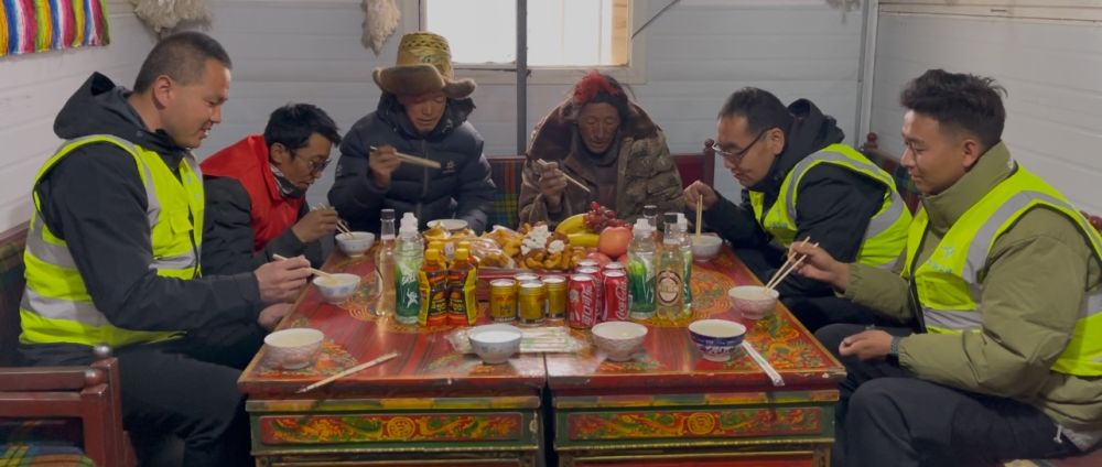 隨著夜幕的落下,大家在暖和的板房里迎接藏歷木蛇新年。