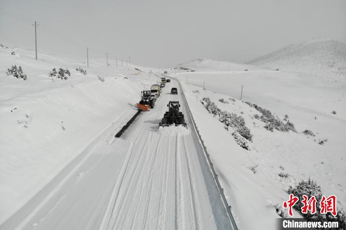 抵達(dá)現(xiàn)場(chǎng)后,武警官兵立即展開任務(wù)情報(bào)偵搜和群眾救助工作,向滯留人員送上熱水和預(yù)防“高反”的藥品,幫助受困車輛脫困,并聯(lián)系公安交警部門對(duì)道路實(shí)施交通管制。因受災(zāi)路段多處于高山之巔,海拔較高、氣候惡劣,且現(xiàn)場(chǎng)降雪持續(xù)不斷,加大了除雪保通任務(wù)難度,為快速恢復(fù)道路通行質(zhì)量,指揮員結(jié)合現(xiàn)場(chǎng)情況,合理劃分人機(jī)編組,果斷采用“多機(jī)協(xié)同、單向推進(jìn)、先推后撒”的戰(zhàn)法展開作業(yè)。